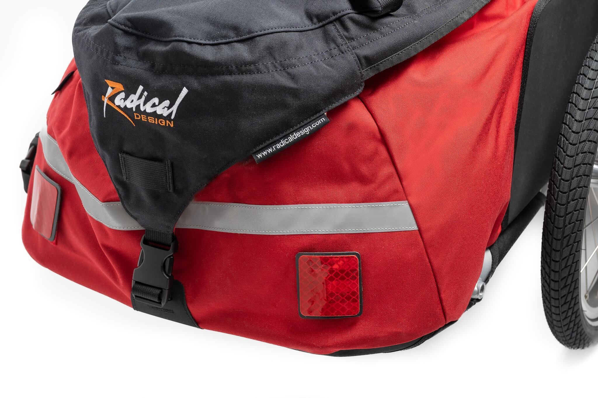 Si vous voyagez en train avec votre Cyclone IV Trekking, vous pouvez enlever les roues et le timon en quelques secondes. La Cyclone se transforme en un gros sac de voyage. Les sacs de voyage peuvent voyager gratuitement dans les trains mais pas les remorques ! La housse optionnelle pour les roues se fixe sur le dessus du sac, le timon peut être glissé dans le sac. La bandoulière fournie et les deux poignées bien larges sur le dessus du sac permettent de le soulever facilement.